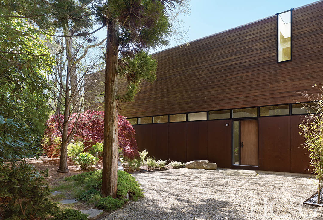 The Japanese-style exterior features windows from Pella Corporation.