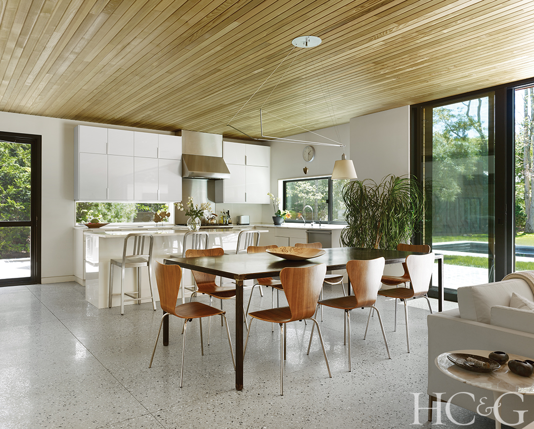 In the kitchen, chairs are from Knoll, barstools are from Design Within Reach, and the cabinetry is from IKEA.