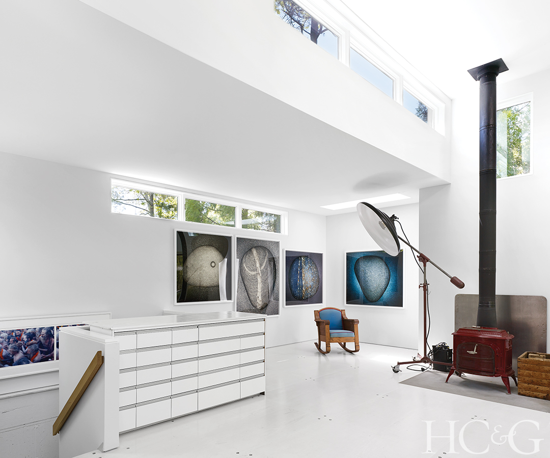 Works in O’Neill’s concrete-and-cedar-clad studio include recent studies of stones, many of which were found locally.