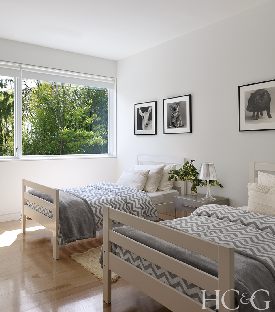 In another guest room, photographs from O’Neill’s “Zoobabies” series are displayed above bed frames from Scott Jordan Furniture.