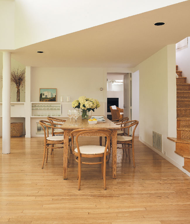 he dining room includes a suite of Le Corbusier beechwood chairs from Thonet; the dinnerware is from Restoration Hardware. Homeowner Anita Hoffman’s mother, Bella Vogel, did the painting of the house as it looked in 1968.