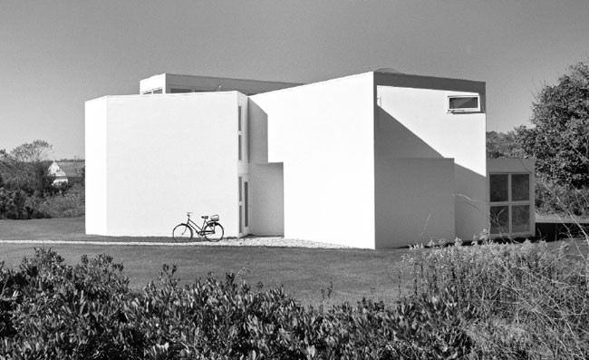 This view from the rear of the house reveals its fully expanded form. Richard Meier designed the original two-story central portion, which dates from 1968.