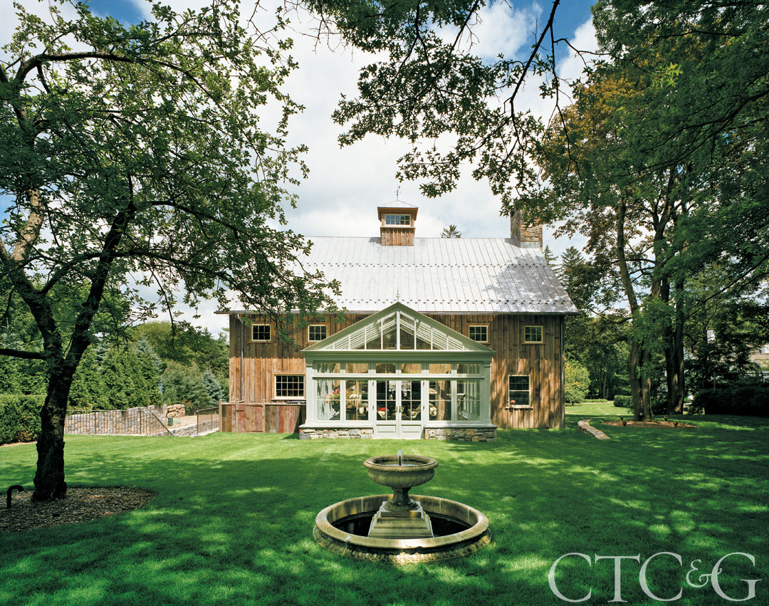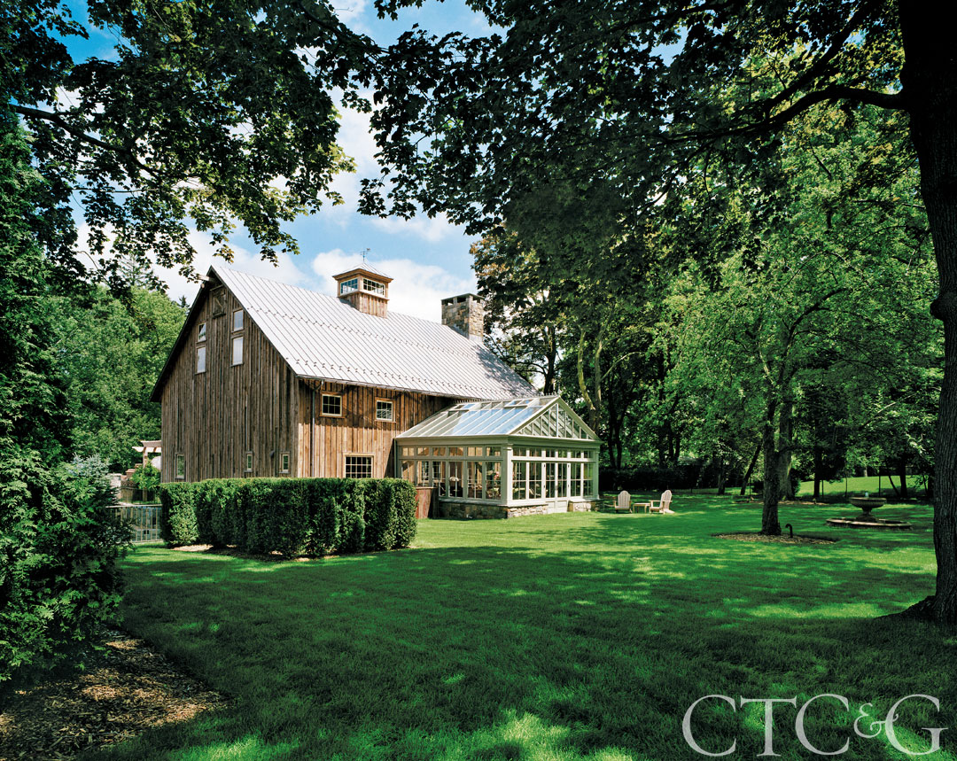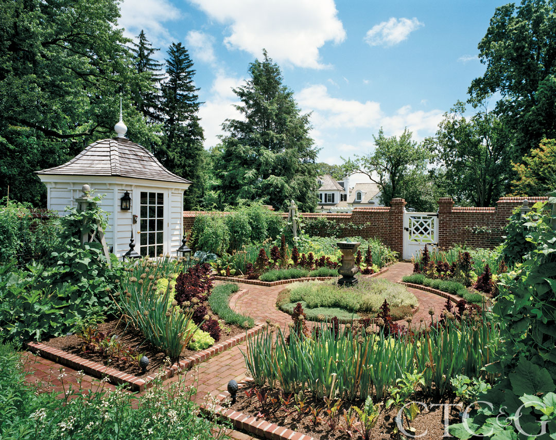 A Colonial-style potting shed and a wall of Flemish bond brick with a Chippendale gate complement the main house, while creating a backdrop for the vegetable and herb garden adjacent to the barn’s pergola.