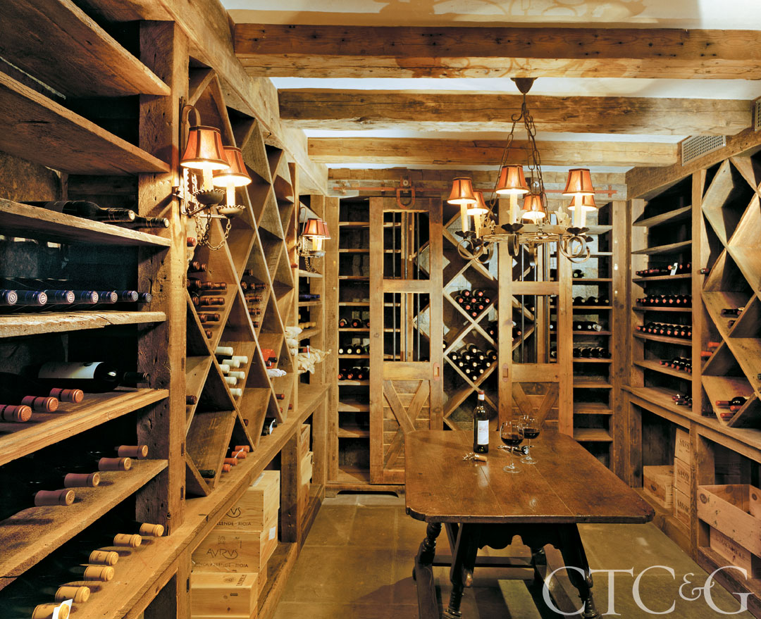 Composed of antique timbers, the Cornerstone Builders wine cellar features a beamed ceiling filled with stucco. The doors were designed to reflect the doors of the horse stalls once located in the barn’s lower level.