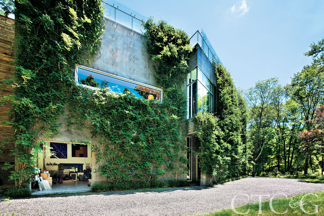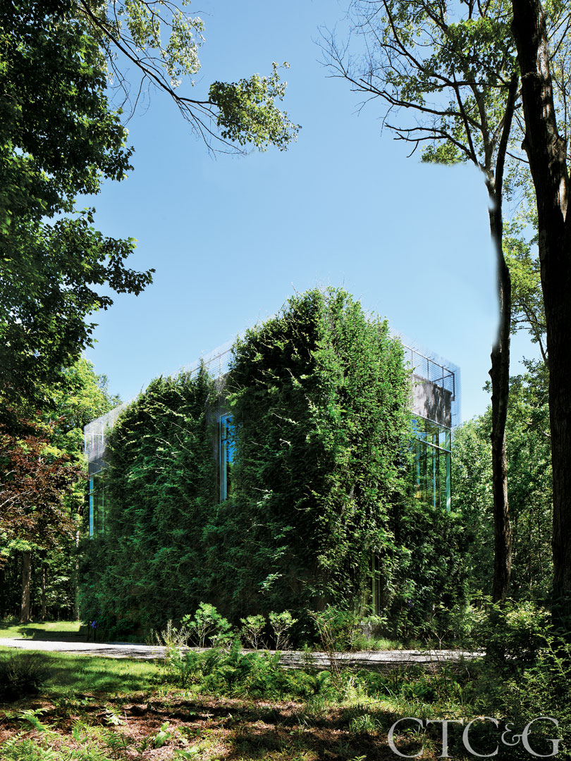 A custom metal grid by Greenscreen supports thick tangles of leafy wisteria. “It’s almost a jacket of green,” says architect Robert Young.