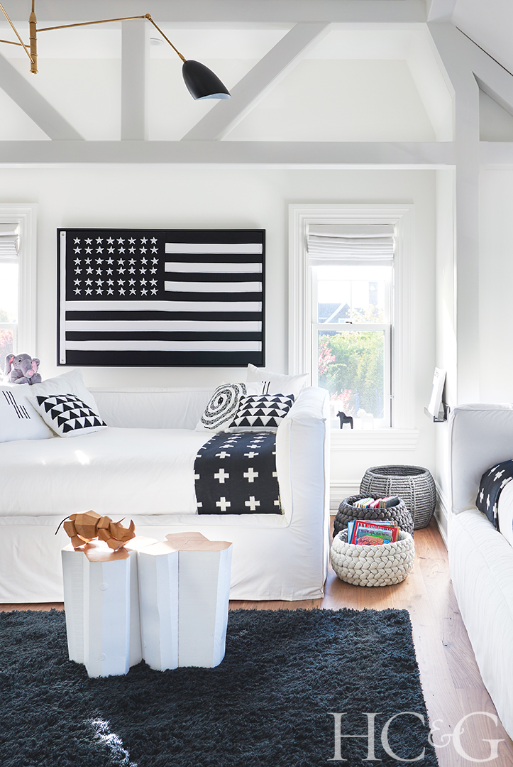 The boys’ bedroom includes slipcovered RH daybeds and Beam stools from West Elm.