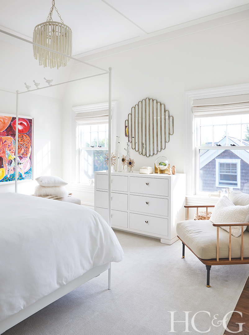 In the master bedroom, Harold Ancart’s Untitled hangs behind a white lacquer and brass dresser and a pair of circa-1958 Spanish chairs by Børge Mogensen.