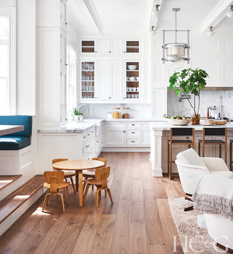 The kitchen countertops and backsplash are covered with statuary marble; the barstools are from BDDW.