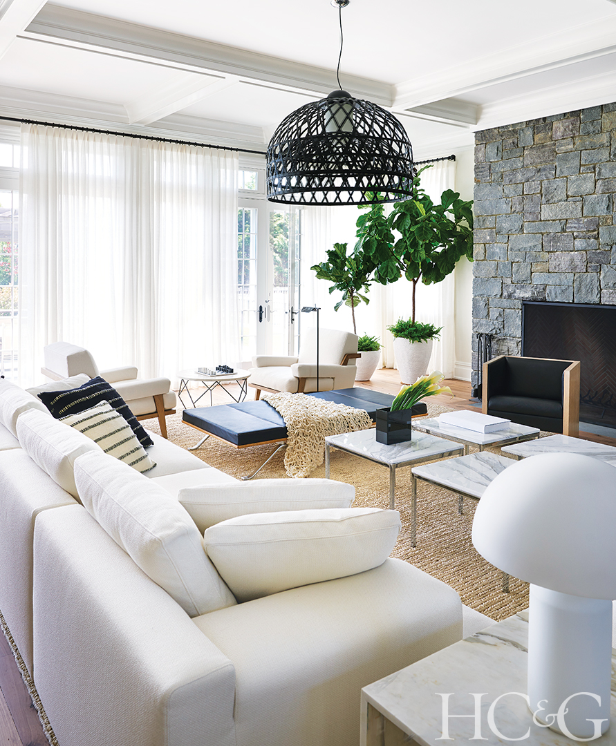 In the living room, an Emperor pendant light from Moooi hangs above a group of Florence Knoll-designed Calacatta Gold marble-topped tables, a Cassina sectional, and Carl Hansen & Søn’s TK8 daybed.