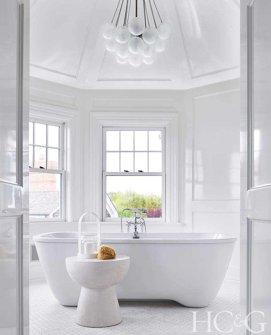 In the master bath, an Apparatus Cloud chandelier hangs above an Elizabeth Dow side table. The tub fixtures are from Waterworks.
