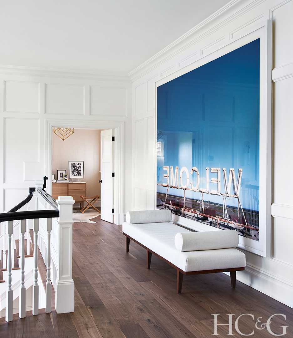 On the second-floor landing, a Severin Hansen-designed daybed anchors a photograph by Jens Assur.