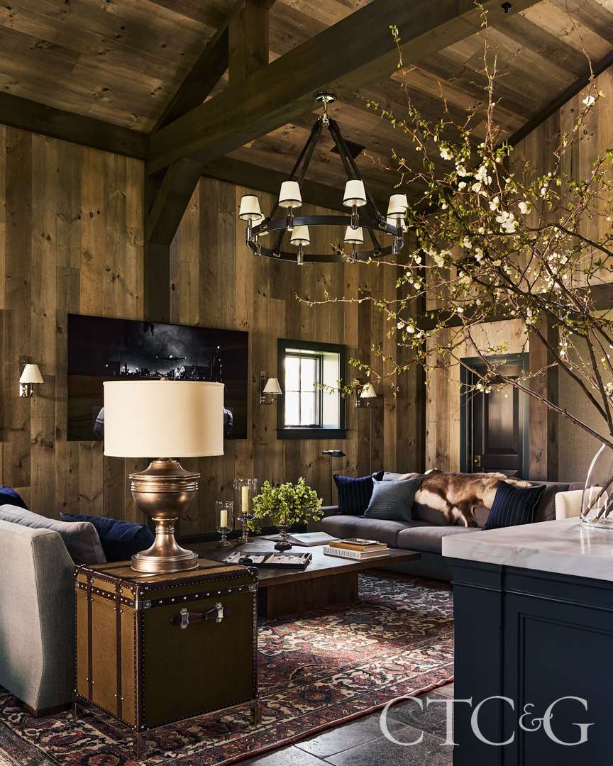 After providing the client with a number of design options, the final choice was the darkest iteration of the bunch with fully clad wood walls and ceiling. “From there, it was about balancing the rustic nature of the materials with the finesse and polish of their contemporary life,” says Major. “Ralph Lauren interiors were a huge inspiration, but I think the space reflects the client’s unique personal tastes and lifestyle as well.”