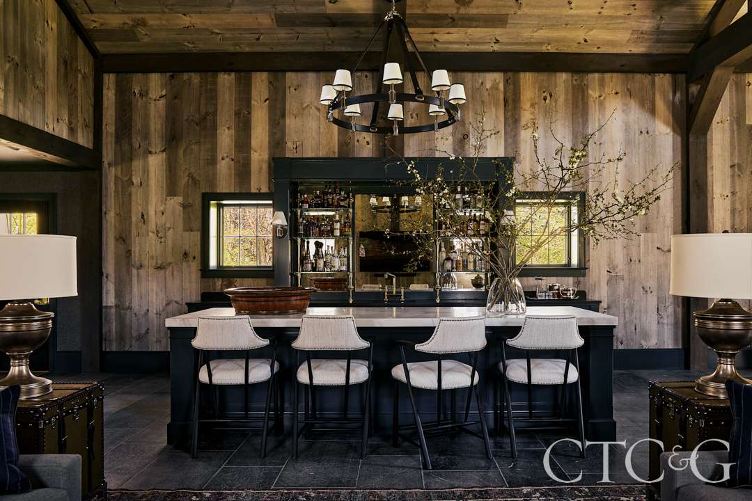 Once the decision was made to embrace a dark and moody vibe, “We pulled palettes that would complement the earthy tones of the wood and floors,” says Major. “This included cocoa leathers, charcoal grey wools, accents of navy and Sherwin Williams Mount Etna trim color throughout, as well as more brown oak furnishings. We balanced it with some lighter elements, like the polished nickel and paper shades on the main light fixtures, calacatta crema marble and lighter upholstery in the bar/kitchen area.”