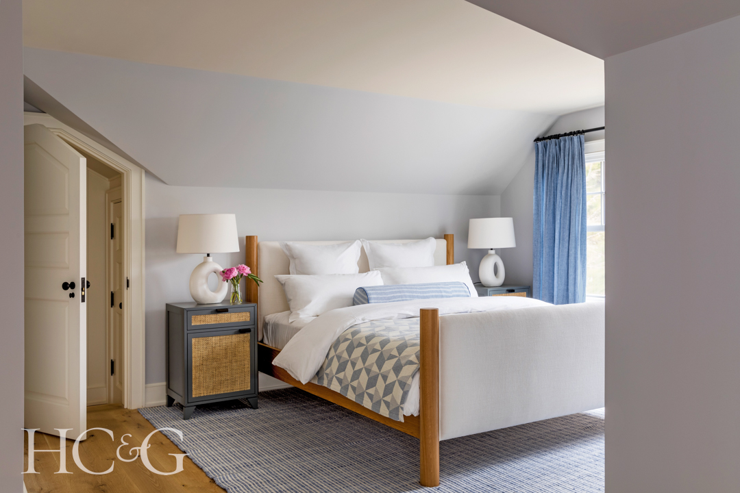 Meanwhile, the primary was essentially left intact, but a deck was added. The living and dining rooms, with their original beams, also remained. “The clients didn’t want to change the barnlike structure of the living room,” says Sferrazza. “There were lots of modifications to the structure, but the changes came from a desire for an open, relaxed sense of flow. Initially, the residence had a large number of doorways, with some snaking hallways and railroad-style rooms. We expanded upon the traditional architecture and tried to keep its charm.”