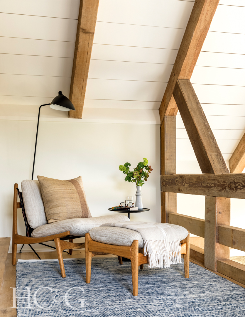 “It’s all about simplicity, the relaxed quality of the beach and appreciating nature,” says the designer, who filled the home with a variety of vintage and found items featuring pale oak tones that jibe with the beams and flooring. “There’s also a California-like, laid-back energy that comes through. I’m not a big fan of decorating. Rather, I enjoy creating homes that feel connected to the architecture, lifestyle and beautiful setting. We tried to bring this place back to life and keep its spirit.” Sferrazza concurs, “It’s essentially a new structure filled with amenities and quality finishes, but it feels as though it has always been there.”