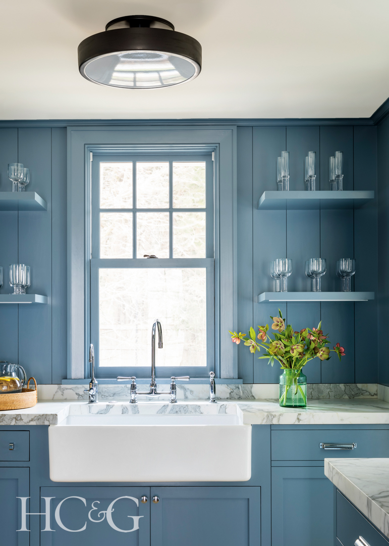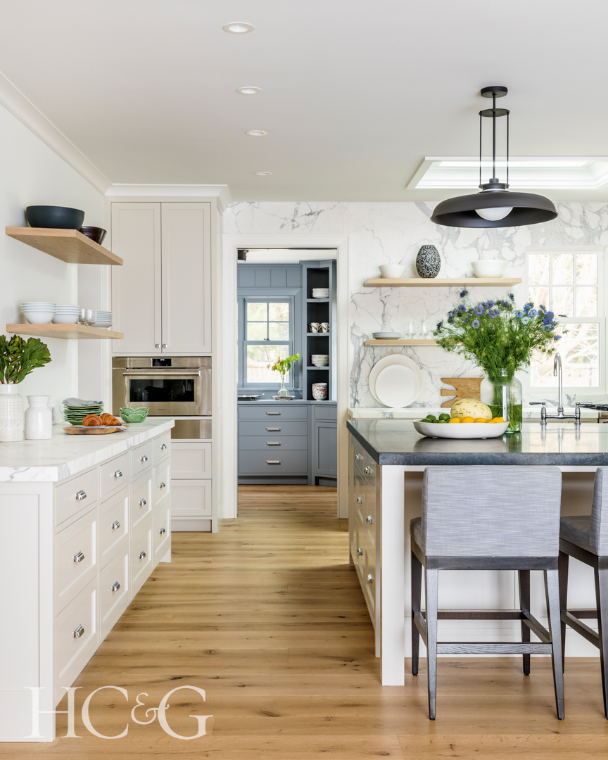 For all its drama, there were also some major issues that needed to be addressed—including an obvious addition that was more modern than the rest of the house. “We took the badly done addition down to its foundation and rebuilt it to blend in with the more traditional architecture,” says architect Charles Sferrazza. Now that portion of the structure contains two ensuite bedrooms. The kitchen was also in dire need of some reworking. “The original kitchen had no natural light,” says the architect. “It’s still located in the front of the house, but we added a skylight and tore down a wall to open up the space to the new family room. From the kitchen, you can look past the family room and out the French doors to the pool and pool house beyond.”