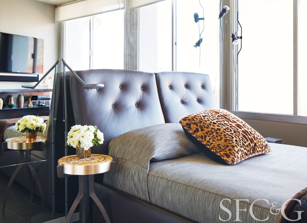 A bed cover crafted of a Zinc Textiles fabric and a pillow in a Brunschwig & Fils leopard print suit Hutton’s Bryant series bed.