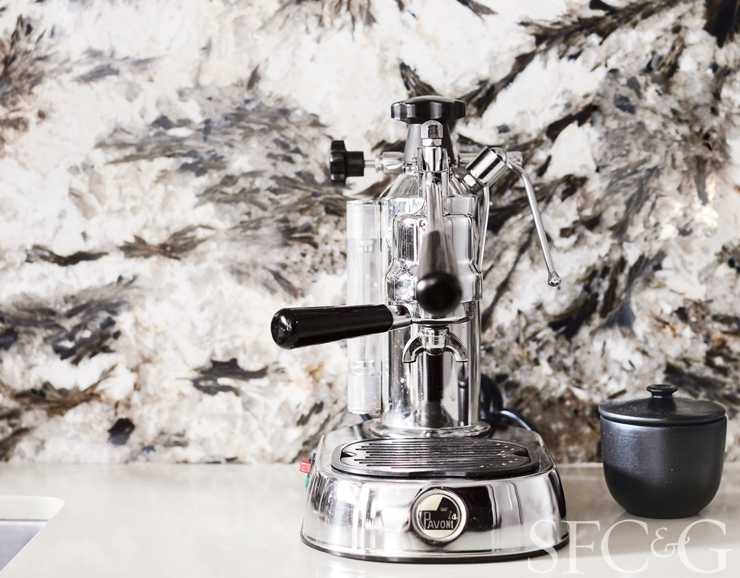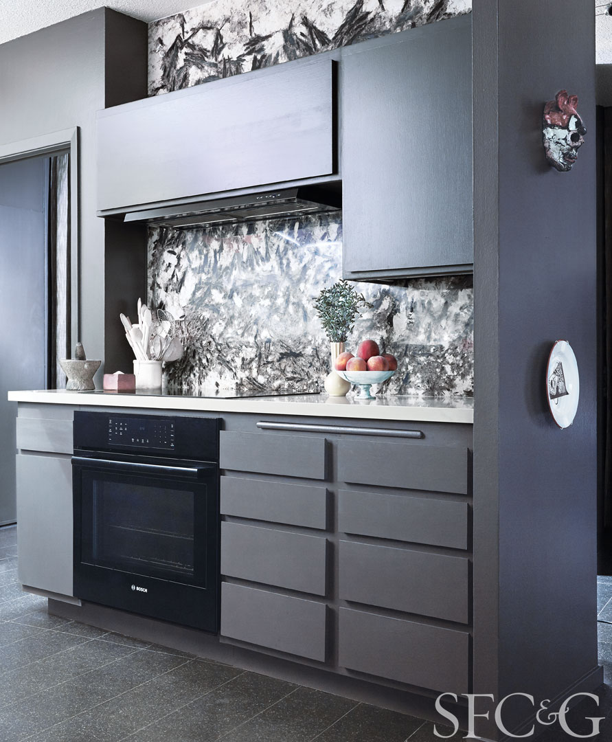 The kitchen is tailored in dark gray with a backsplash of Brazilian quartzite; Bosch oven is through Ferguson.