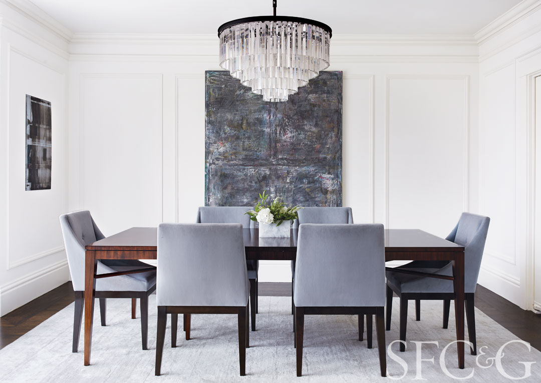 The Mister Miyagi Painting No. 20 by Gijs Van Lith dominates the dining room; art on left wall is by Ryan Foerster. Chandelier is from RH; chairs are from West Elm.