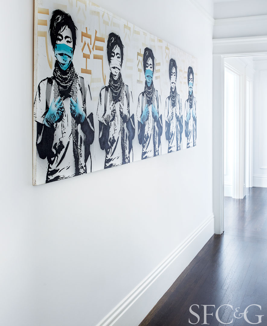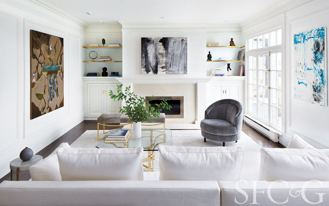 In the living room, works include Damien Flood’s Dig (left wall) and Zheng Chongbin’s Gravitational Plain (above fireplace). Upholstered swivel chair is from ABC Home; bench is from MadeGoods; vintage brass and glass coffee table is through 1stdibs.
