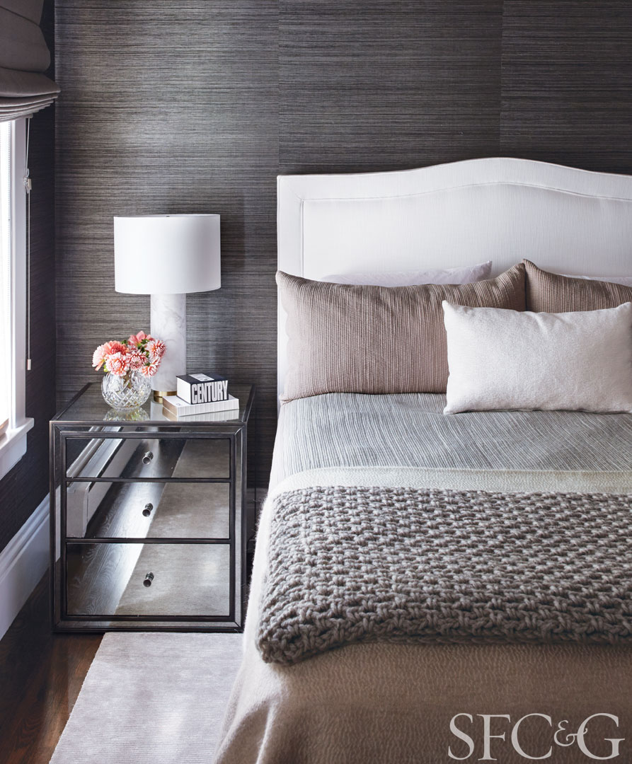 A black and white Phillip Jeffries grasscloth lines the walls of the guest room, where sumptuous bedding from Jessie Black creates a cozy nest.