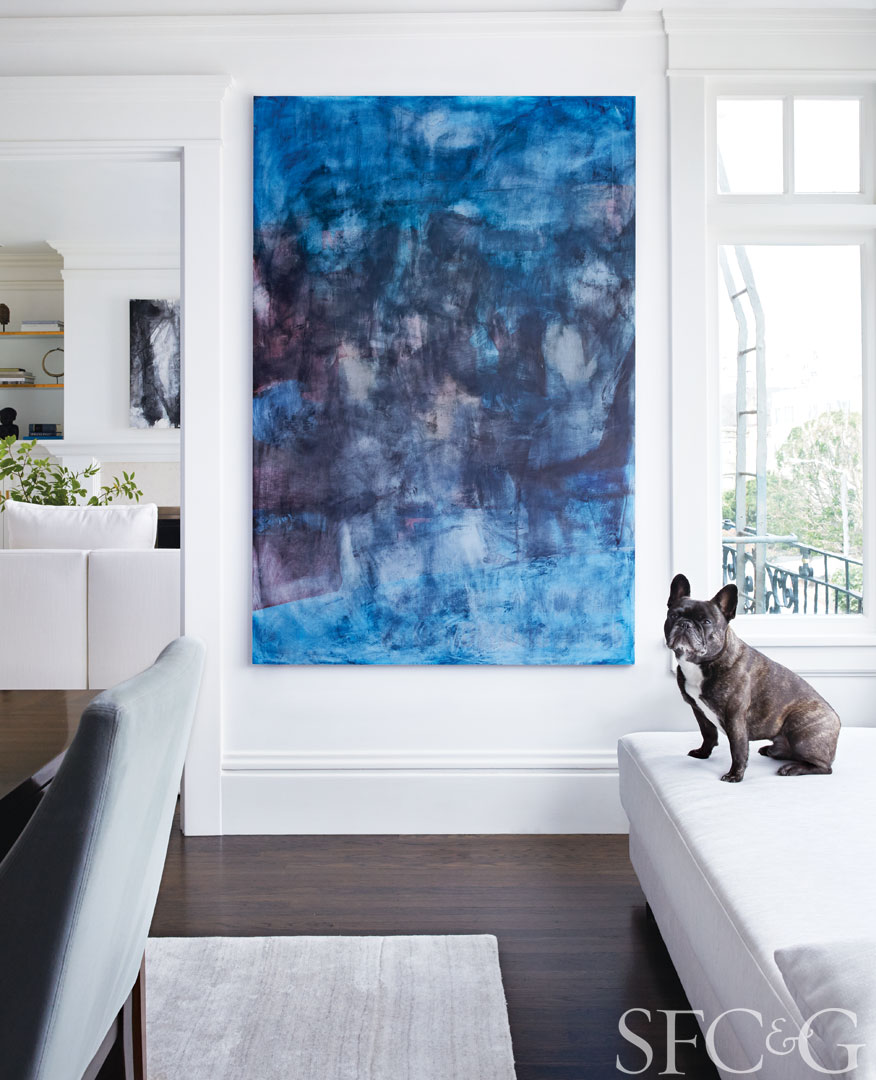 Lucas Jardin’s Blues 2014 anchors one end of the dining room, where Baxter’s French Bulldog, Marcel Duchamp, feels right at home atop a Design Within Reach daybed upholstered in Holly Hunt Slate fabric.