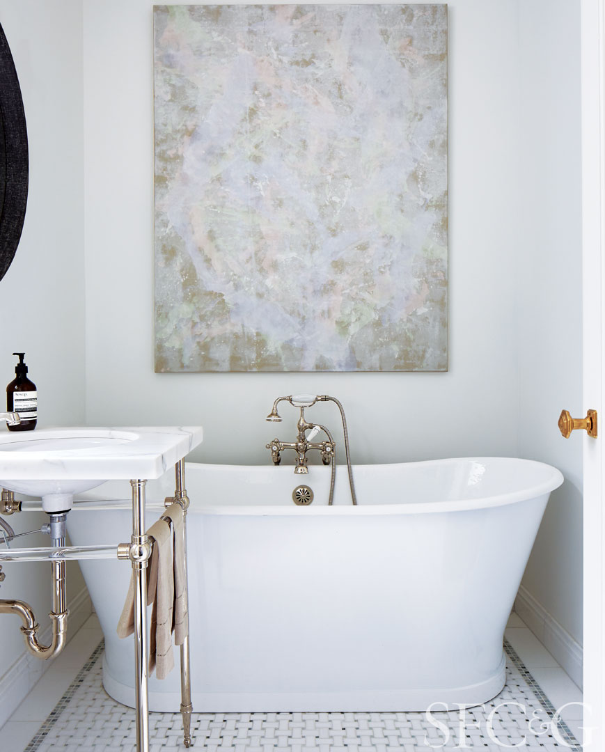 In the bathroom, Toothpaste for Trespassers II by Tyra Tingleff, commissioned by Baxter for the space, hangs over an RH tub.