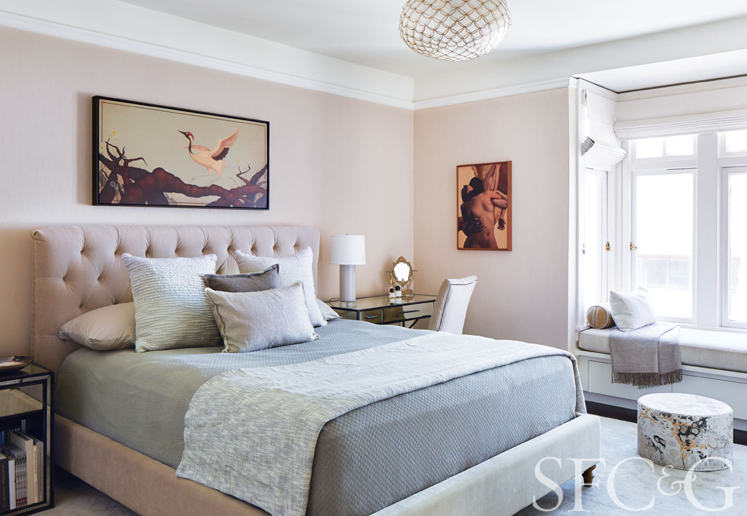 A Serena & Lily pendant provides a shot of glamour in the master bedroom, while artwork by Tiffany Bozic (above the bed) and Matthew Stone (right wall) determined the color palette, which is also reflected in an Alicia Adams ottoman.
