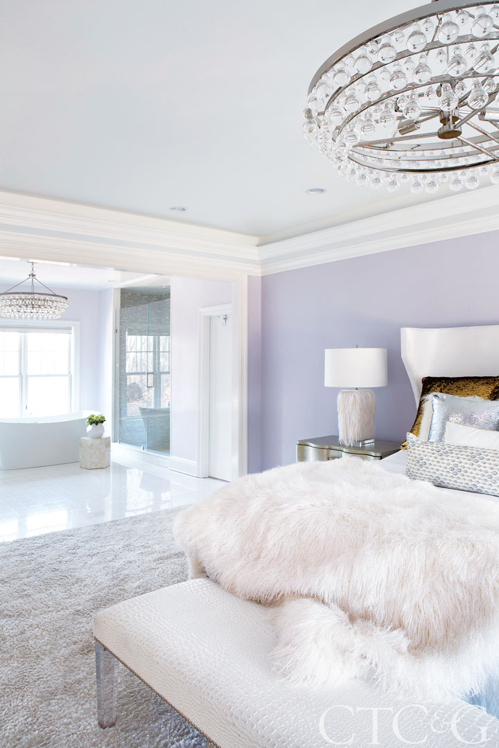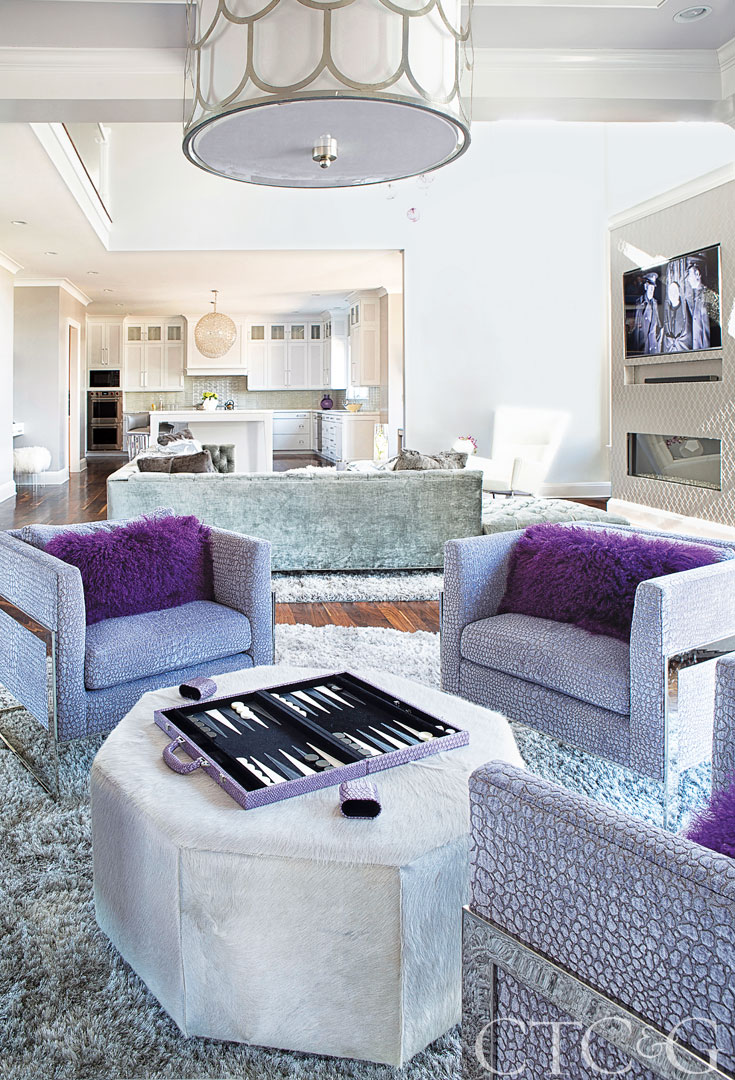 A Shakuff chandelier of 25 handblown glass globes creates a cascade of purple, silver and white in the main foyer.