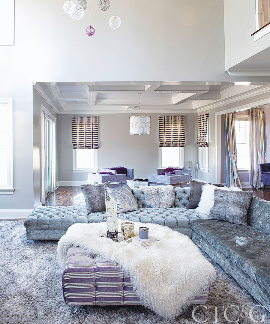 A custom Hollywood sectional wrapped in velvet and an ottoman in Cowtan & Tout fabric invite lounging in the family room. Shag rug is through Carpet Trends.