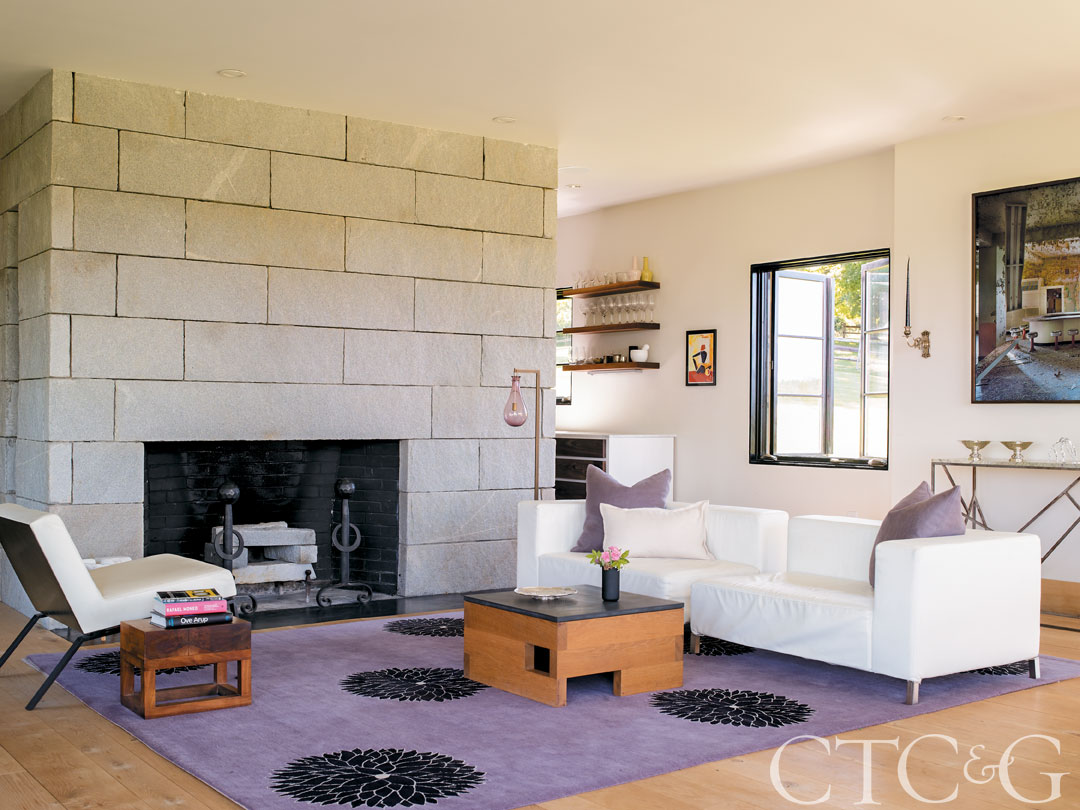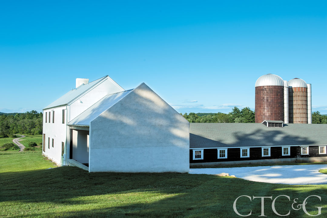 The new buildings juxtaposed with an existing barn form a T-shape. The large open stucco structure screens the house from the road. Curbstone running around the base of the perimeter anchor the house to its environment.