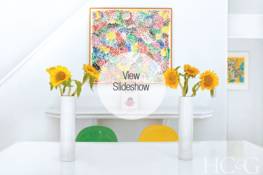 The dining area, too, started out all white, with a custom white Formica table and chairs, but then the D’Angelos upgraded to a suite of colorful original 1970s Panton chairs at a local tag sale. A vibrant artwork by Don Francis, spotted by Sofia at the Guild Hall Clothesline Art Sale, further punctuates the space.