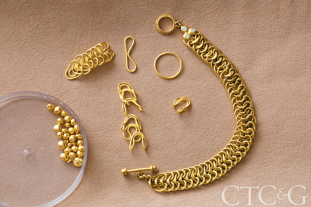 The combination of ancient techniques with modern methods defines Faye Kim’s work. Working in pliable and rich 22K gold, the results are simple, modern, timeless and eminently wearable, like the hand-woven Alexandria bracelet, with granulation detail on toggle closure. Westport, 203-226-3511, fayekimdesigns.com.