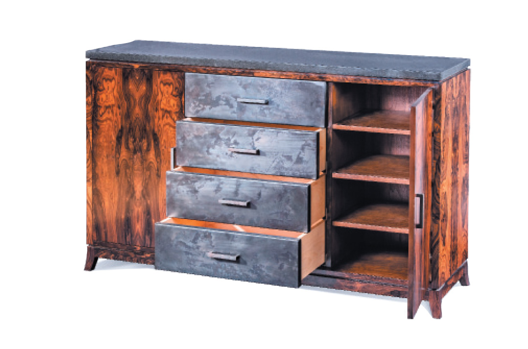 A fourth-generation artisan with a lifetime passion for furniture, Gregory Clark uses the best of New World techniques combined with artisanal methods, such as dovetails, mortised joinery and hand-rubbed finishes to produce his custom line. The Thayer buffet features ziricote wood with walnut interiors, absolute black granite top and steel-front drawers with a blackened patina. Wilton, 203-515-1122, gregoryclarkcustom.com.