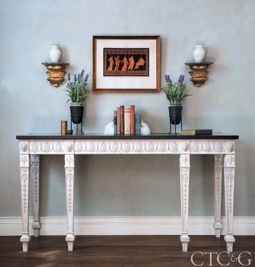 What began with the restoration of boats in San Francisco Bay has moved east and blossomed into a custom design workshop. At his eponymous studio, Kevin Cross applies decorative painting, including gilding, to interior furnishings. He also restores antique pieces. His artistry is evident in this Neoclassical six-legged table painted in a stone color finish. Redding, 203-938-9818, kevincrossstudio.com.