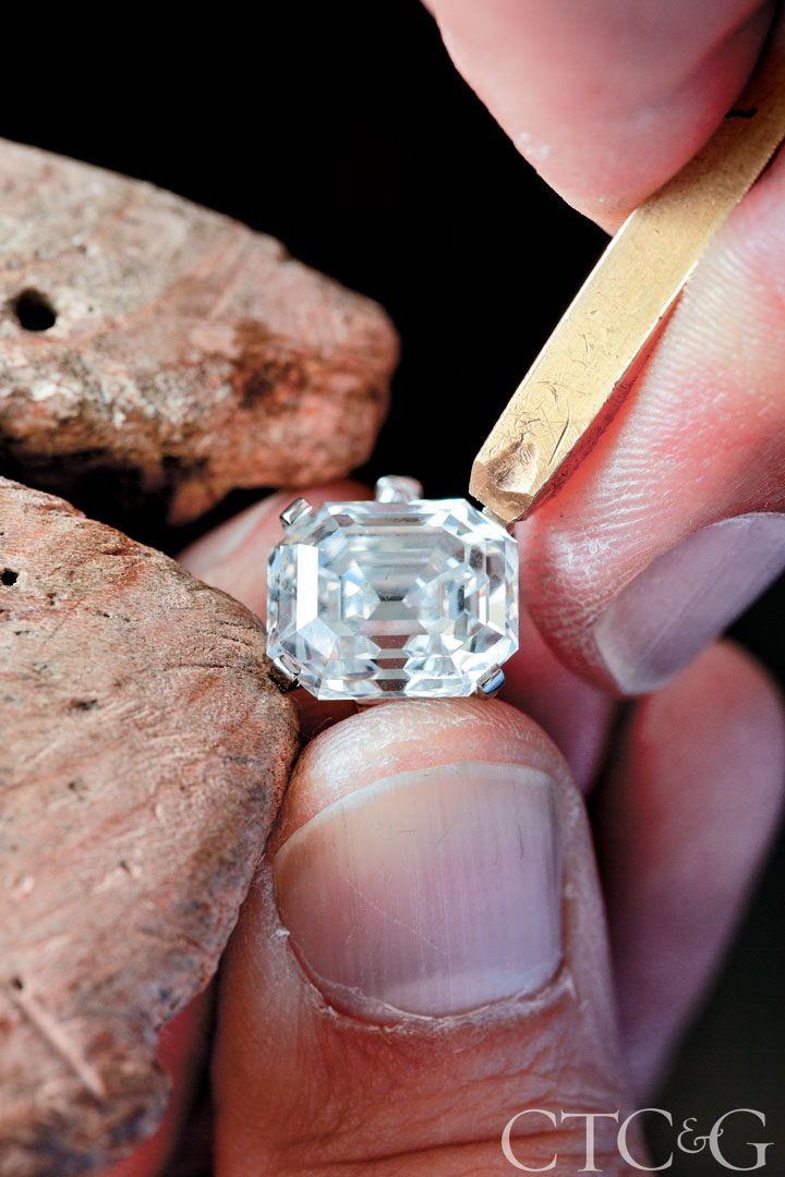 Celebrating 30 years, Steven Fox specializes in precious estate jewels as well as rare gemstones in his own personal designs. Fox has a passion for gemstones with character. This vintage 11.50-carat elongated diamond was cut by the renowned Royal Asscher Diamond Company in the Netherlands during the turn of the 20th century and is being set in his atelier.