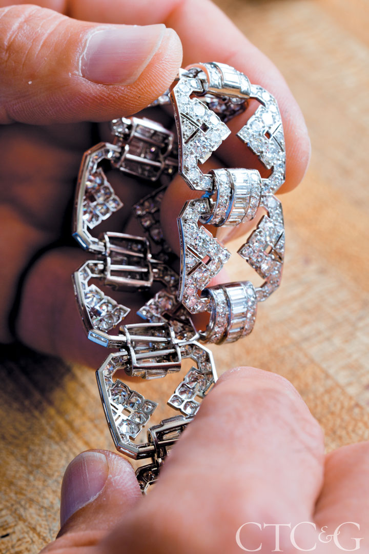 A platinum and diamond Art Deco bracelet from the house of Udall & Ballou, circa 1930, is inspected and prepared for restoration. Greenwich, 203-629-3303, stevenfoxjewelry.com.