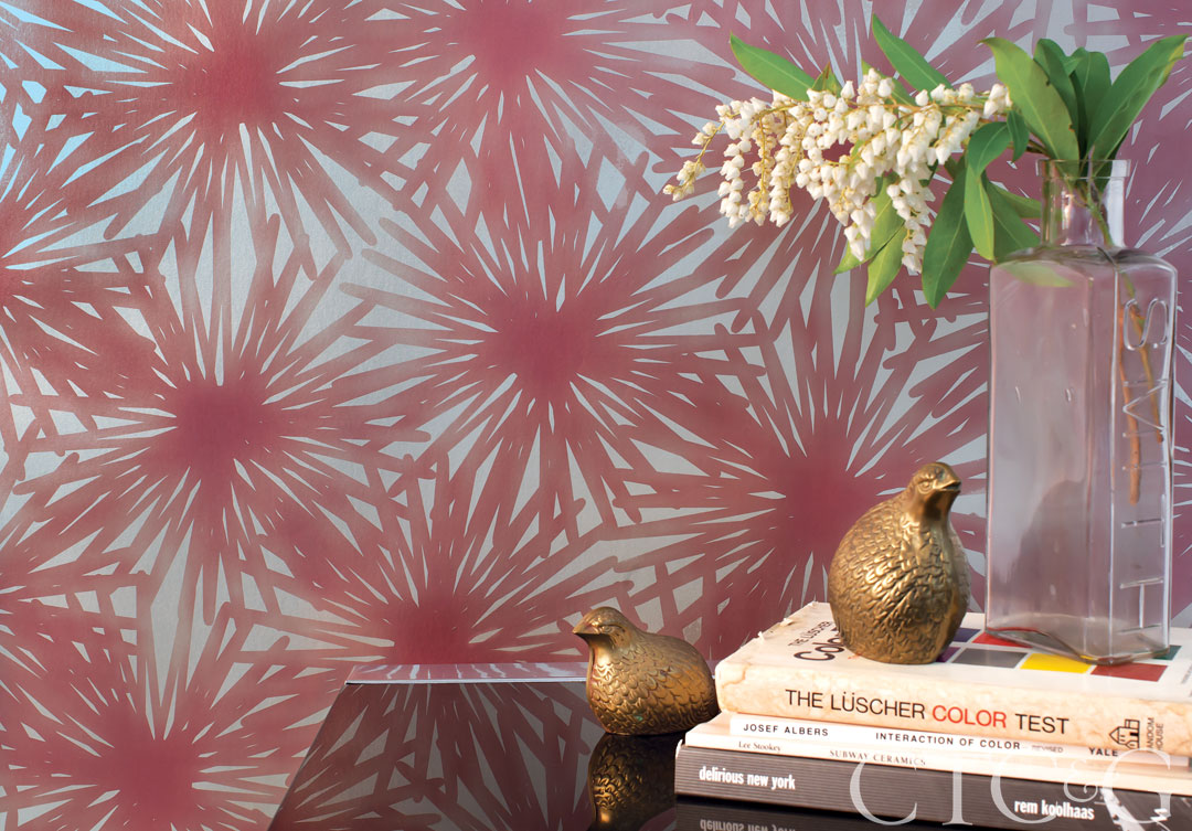 Kyra and Robertson Hartnett are the husband-and-wife team behind Twenty2, a collection of wallpapers that is modern, colorful and edgy. Inspired by the things around them, Bianca began as a photo of a favorite tree then was manipulated into a repeat pattern and digitally produced with water-based inks on pearlescent paper. It is available in four colors, like First Blush (shown at right). Litchfield, 888-222-3036, twenty2.net.