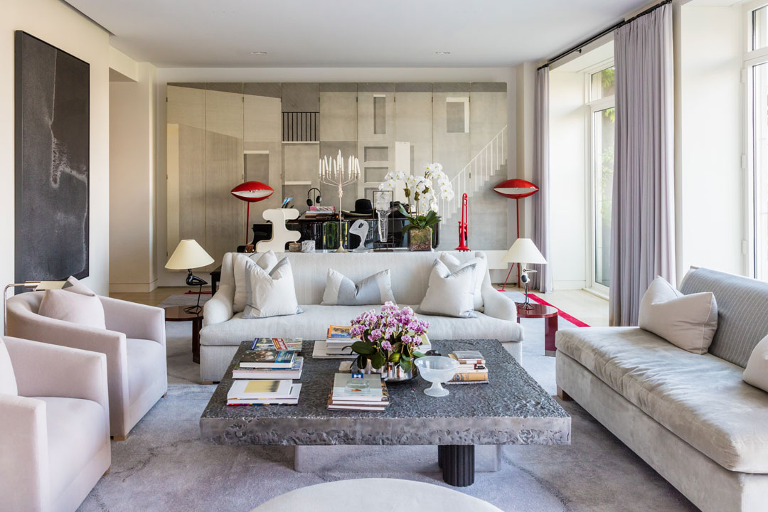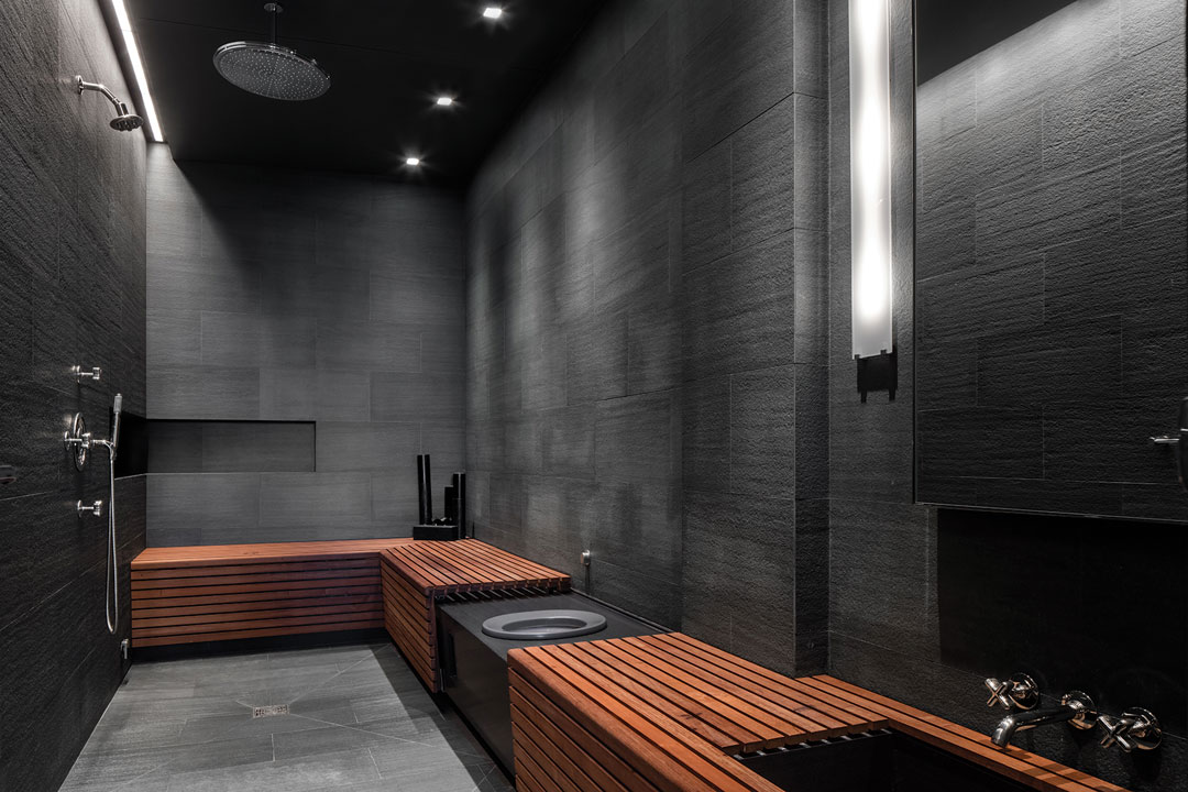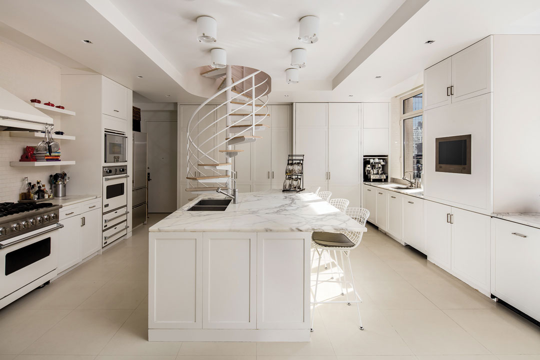 Sting and Styler were among the first buyers at the iconic Robert A.M. Stern-designed 15 Central Park West and picked up this residence for nearly $27M from the developer in 2008. The listing notes that the home was custom-designed for the couple by noted designer Lee Mindel of Shelton, Mindel & Associates, who added the 2 sculptural spiral staircases that access the upper level and provide architectural focal points. The 3-bedroom unit spans 5,417 square feet and features 10-ft ceilings throughout as well as multiple sets of glass French doors that access nearly 400 square feet of private terrace space. A unique gas fireplace feature separates the sprawling living room into 2 distinct areas: an entertaining-friendly formal sitting area and a cozy library lined with walls of built-in bookshelves. The other side of the residence houses an elegant dining room, a media room and a “designer chef’s catering kitchen” with 3 Miele dishwashers.