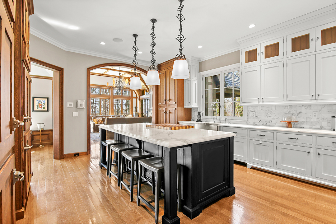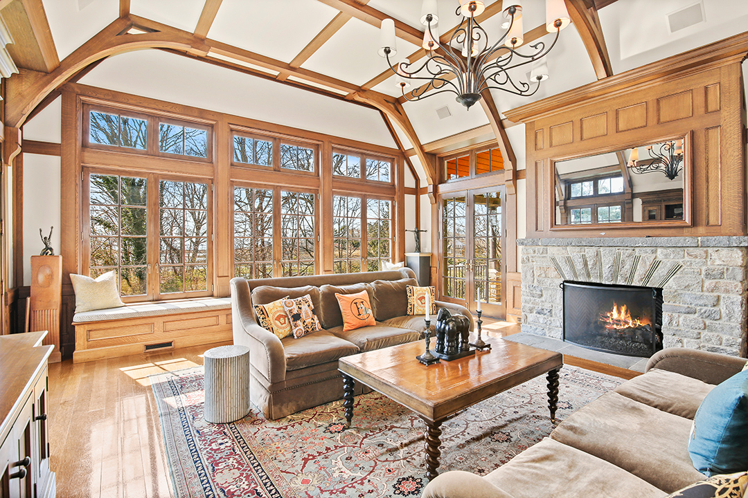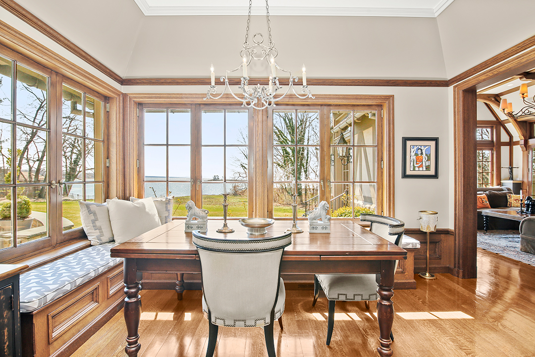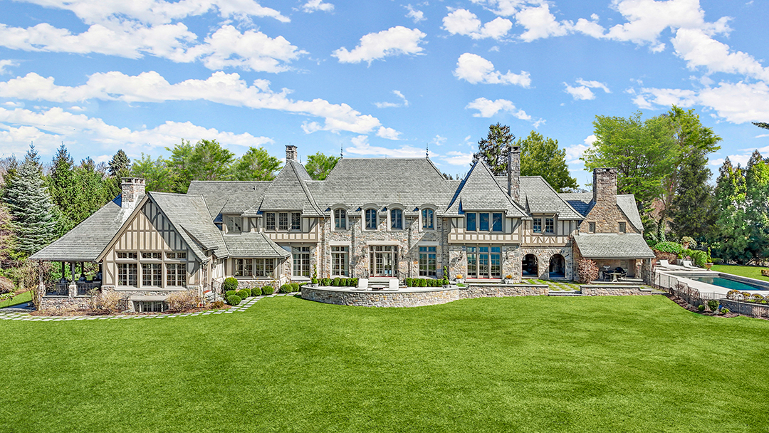 The gracious stone manse was designed by Douglas VanderHorn of VanderHorn Architects and has all the most sought-after features, starting with the back-to-front foyer that leads from the front courtyard to the wide double doors opening onto a back terrace-with views over Long Island Sound every step of the way. There’s a wood-paneled library with a fireplace, an expansive kitchen adjoined by a family room and a primary suite with a fireplace in the bathroom, and on the lower level, a wine room, a media room and a home gym.