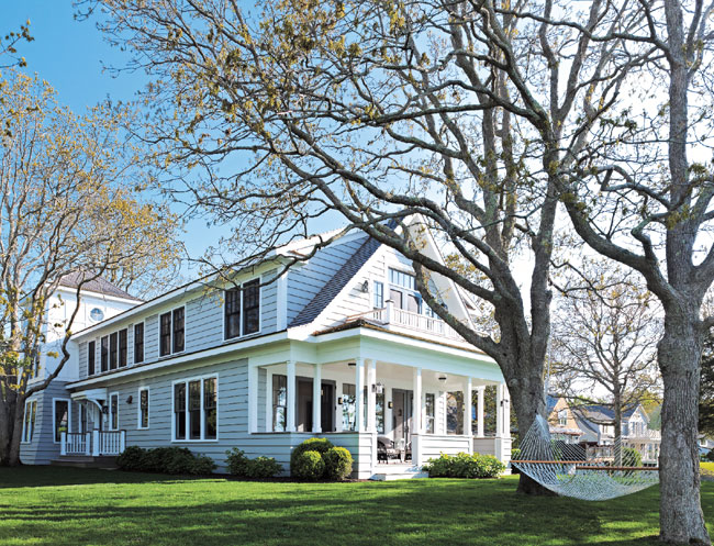 Summery Splendor | Adirondack chairs await the sunset over Wooley Pond and Little Peconic Bay beyond. Aside from the tower, the house’s design is relatively low-slung, with all rooms oriented toward views of the water.