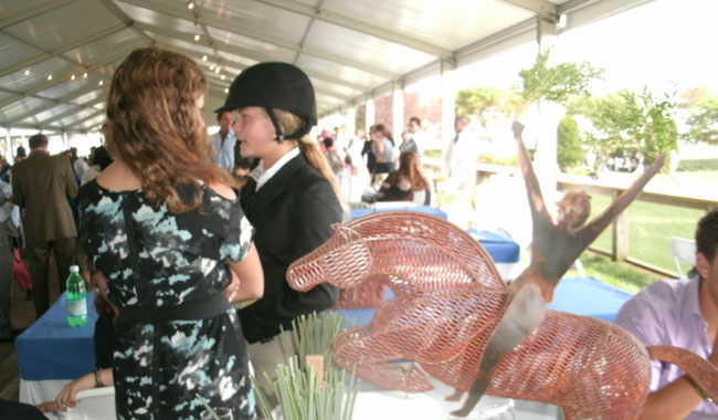 Hamptons Cottages Editor Kendell Cronstrom came early to survey the scene and manage judging. Besides Third Place to Nespresso, we awarded second place to the extravagant cheese and fruit exhibit with wire lanterns designed by Steven Gambrel for Firefly Farm. “Best of Show” winner was Marsia Holzer, with two tables featuring horse head figurines and an enthusiastic rider mounted on a rattan horse.