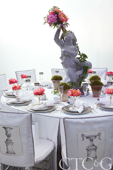 Silvina LeoneLinen Tablecloth and Detailing Silvina Leone with A. Branca’s rouge/grey melograno fabric for Schumacher and M&J Trimming’s gimp. Executed by: Quilt Frame, Inman, SC All other tabletop items Silvina Leone’s private collection | 917.215.5496