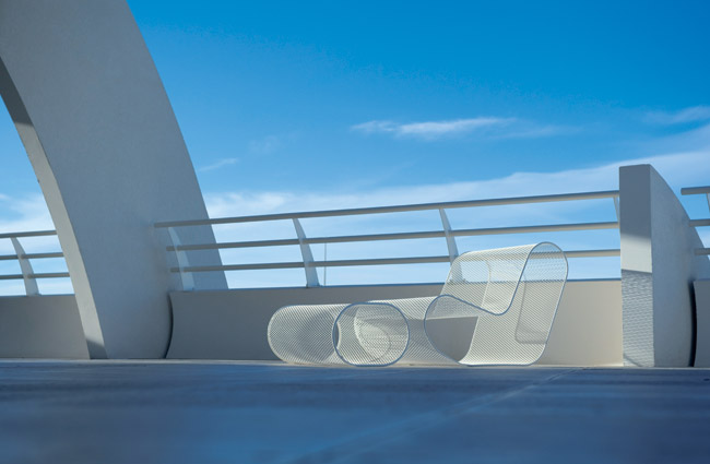 La Grande Motte Mesh chauffeuse and ottoman—Francois Azambourg’s contemporary designs for Oxyo—are crafted from powder-coated steel and can be finished in a choice of three whimsical hues as well as black or white. Through The Future Perfect, 415-932-6508, thefutureperfect.com.
