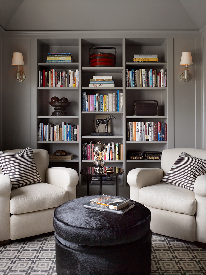 In the library, the console and vintage chair are from March San Francisco. The applique is from Ralph Lauren Home, and the patterned carpet is from Stark Carpet.