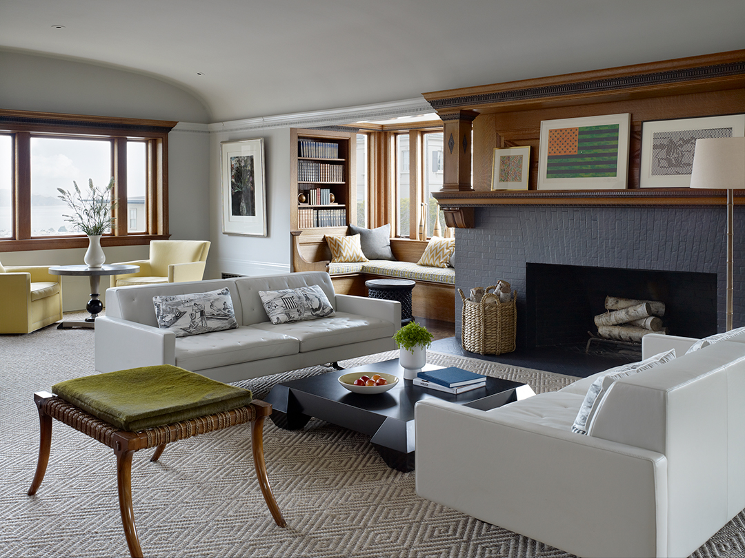 Rich wood paneling is an important yet subtle detail in the living room; however, the tall baseboards could also make the room feel oppressive. To elongate the room, the designers painted the walls, ceiling, and upper and lower moldings the same color. A textured rug from Stark Carpet/a> is elegant and refined, while a framed flag by Jasper Johns brings added color into the room. Matching white Kennedee sofas, separated by a low coffee table by Andrée Putman from Troi Carats et Demi, tie the space together. The stool is vintage.