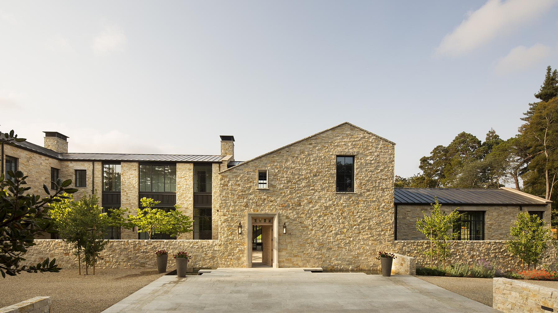 The sprawling house features stone walls, steel-framed windows and roofs, and beams of cedar; the series of linked structures makes the scale seem more welcoming.