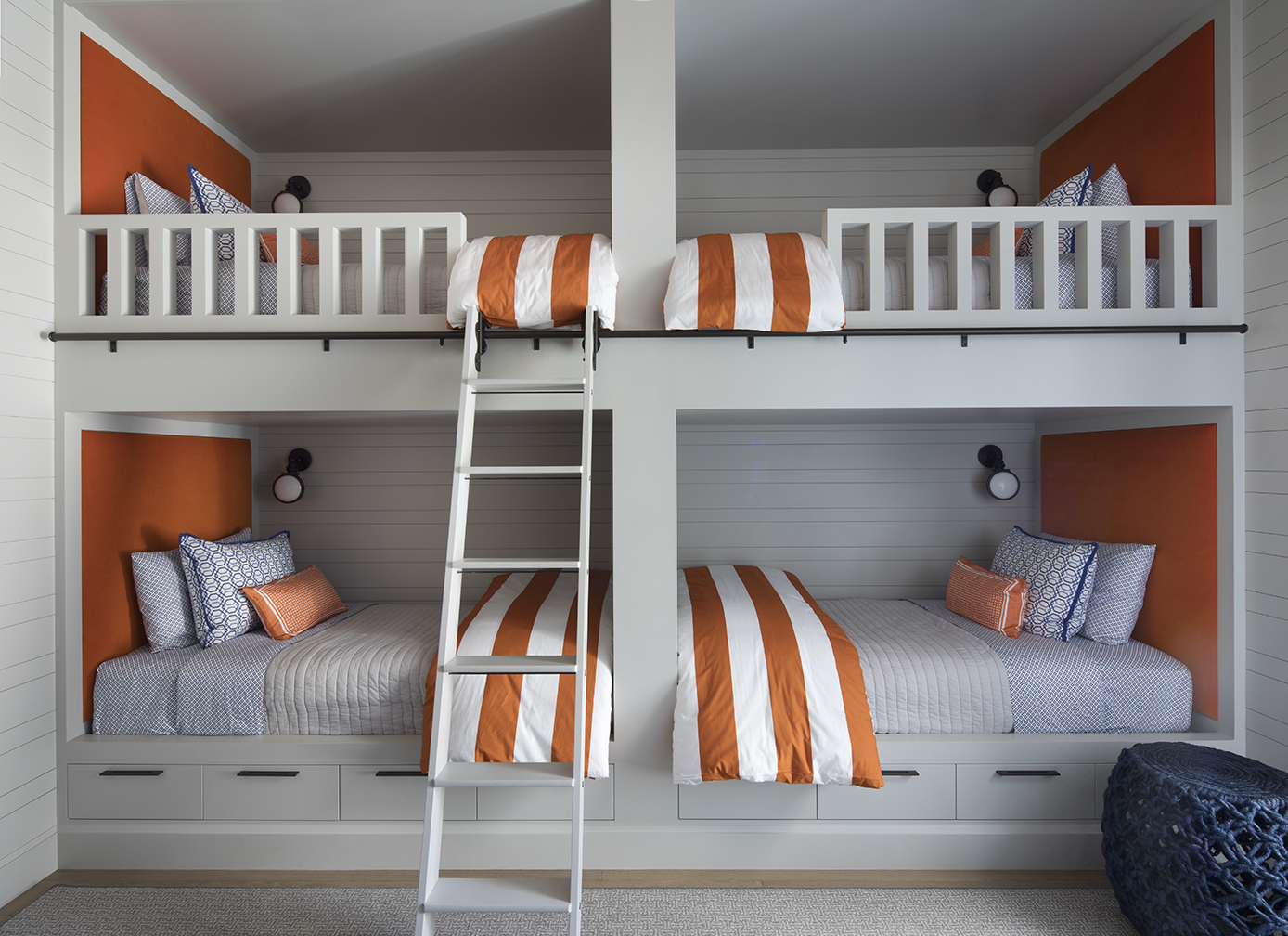 The chidren’s playroom features curtains of a Brunschwig & Fils fabric; the modular sofa from Pottery Barn was reupholstered, and the pendant lights are by Paul Ferrante.