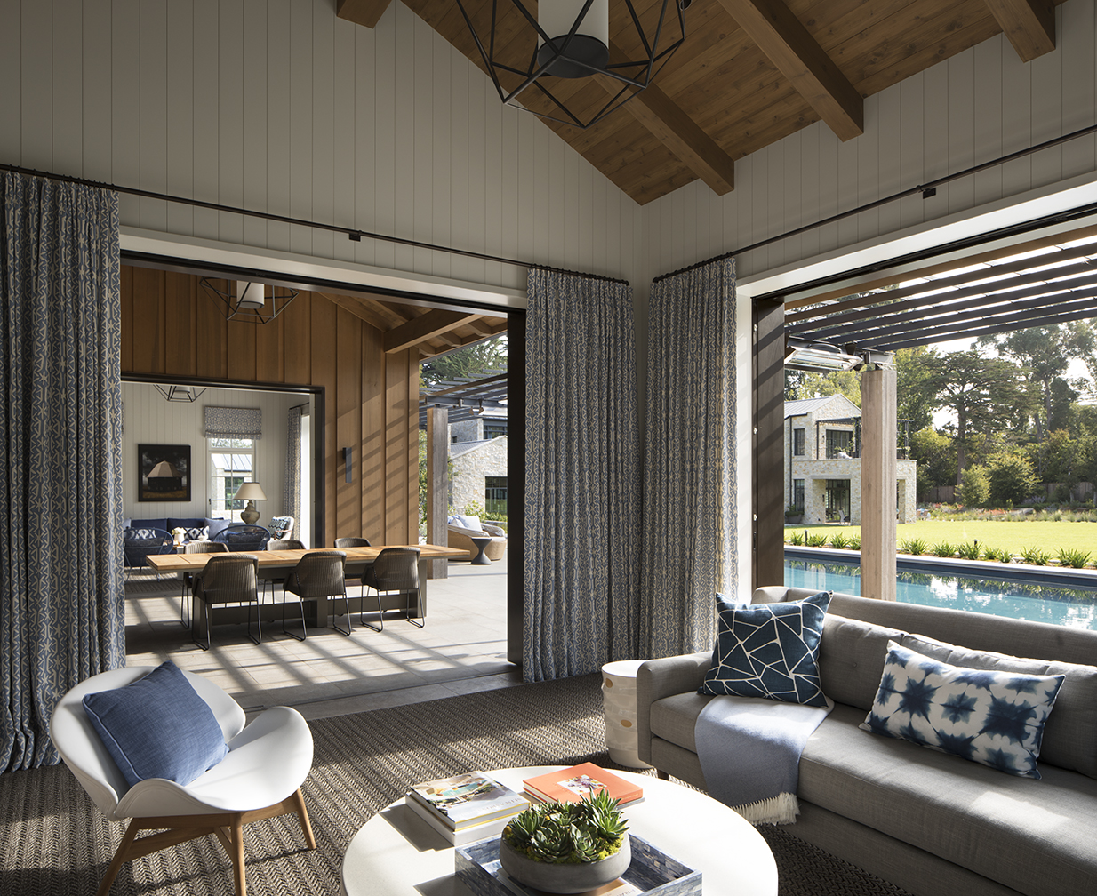 In the poolhouse, the sofa is from West Elm, the side chair by Gloster is available at Dunkirk & Associates, and the cocktail table is from Anthem Home.