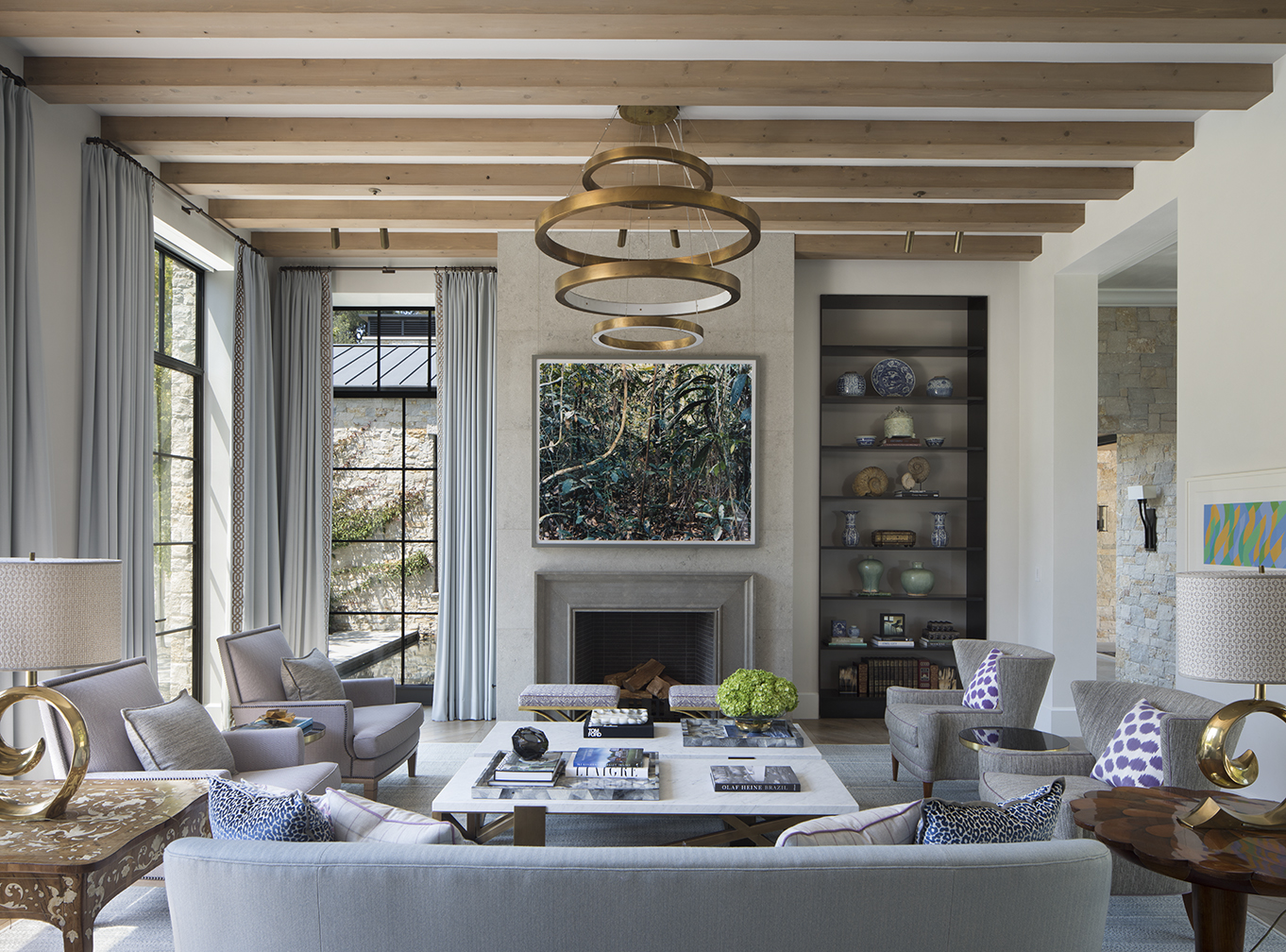 In the living room, the cocktail tables by Tuell + Reynolds are from DeSousa Hughes, the pendant light by Henge is from NIDO Living, and a sofa by A. Rudin is flanked by chairs by Holly Hunt, left, and Paul Frankl.